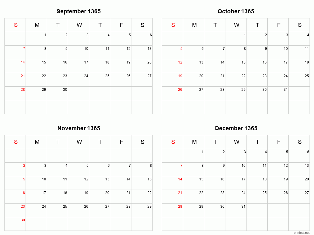 Download printable four months per page calendar for September to December 1365. To change first day of the week to Monday, click here.