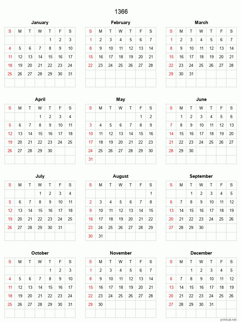 Download free printable calendar for 1366. This Full-Year Calendar template is laid out in Grid style. To change first day of the week to Monday, click here.