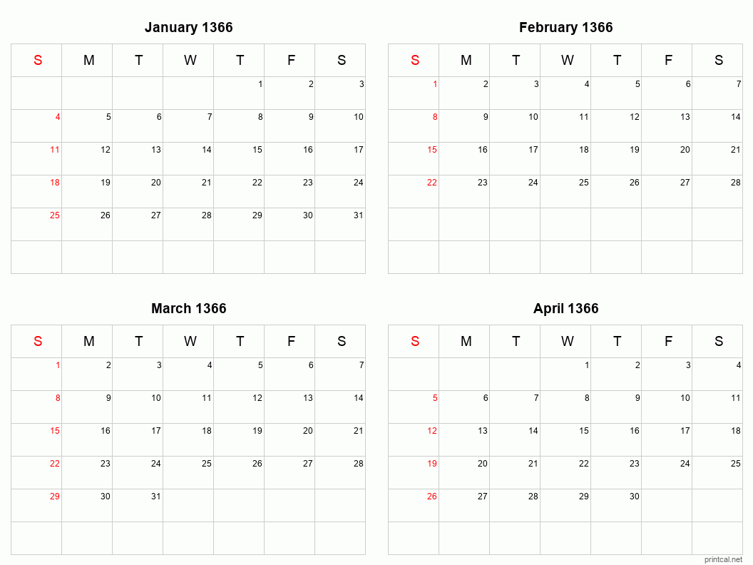 Download printable four months per page calendar for January to April 1366. To change first day of the week to Monday, click here.