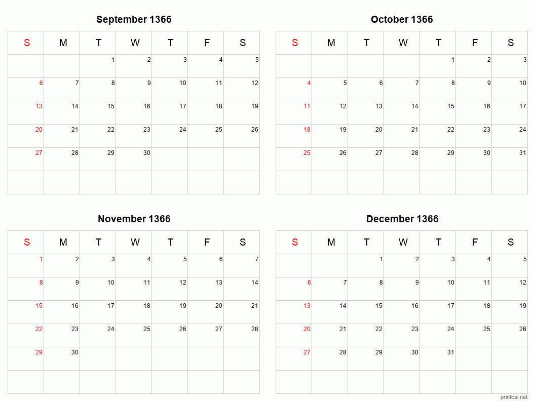Download printable four months per page calendar for September to December 1366. To change first day of the week to Monday, click here.