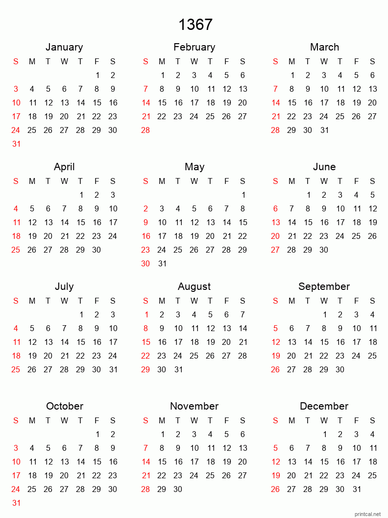 Download free printable calendar for 1367. This Yearly Calendar template is laid out in Tabular style. To change first day of the week to Monday, click here.