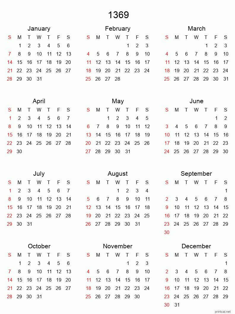 Download free printable calendar for 1369. This Yearly Calendar template is laid out in Tabular style. To change first day of the week to Monday, click here.