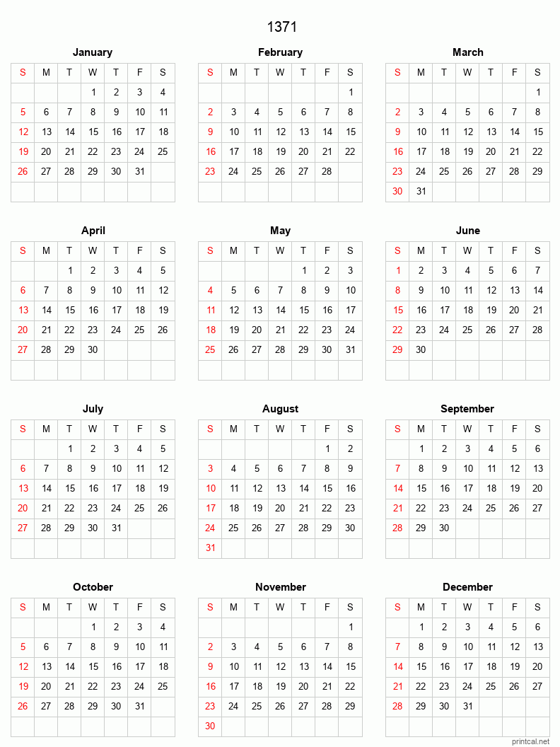 Download free printable calendar for 1371. This Full-Year Calendar template is laid out in Grid style. To change first day of the week to Monday, click here.