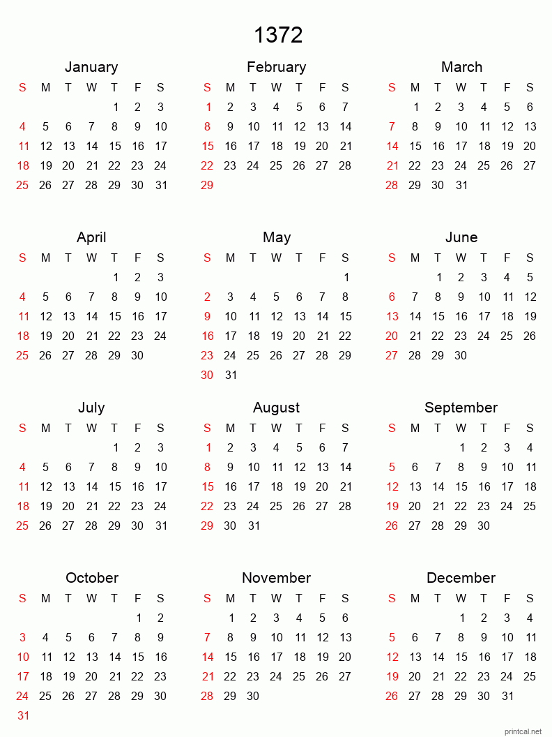Download free printable calendar for 1372. This Yearly Calendar template is laid out in Tabular style. To change first day of the week to Monday, click here.