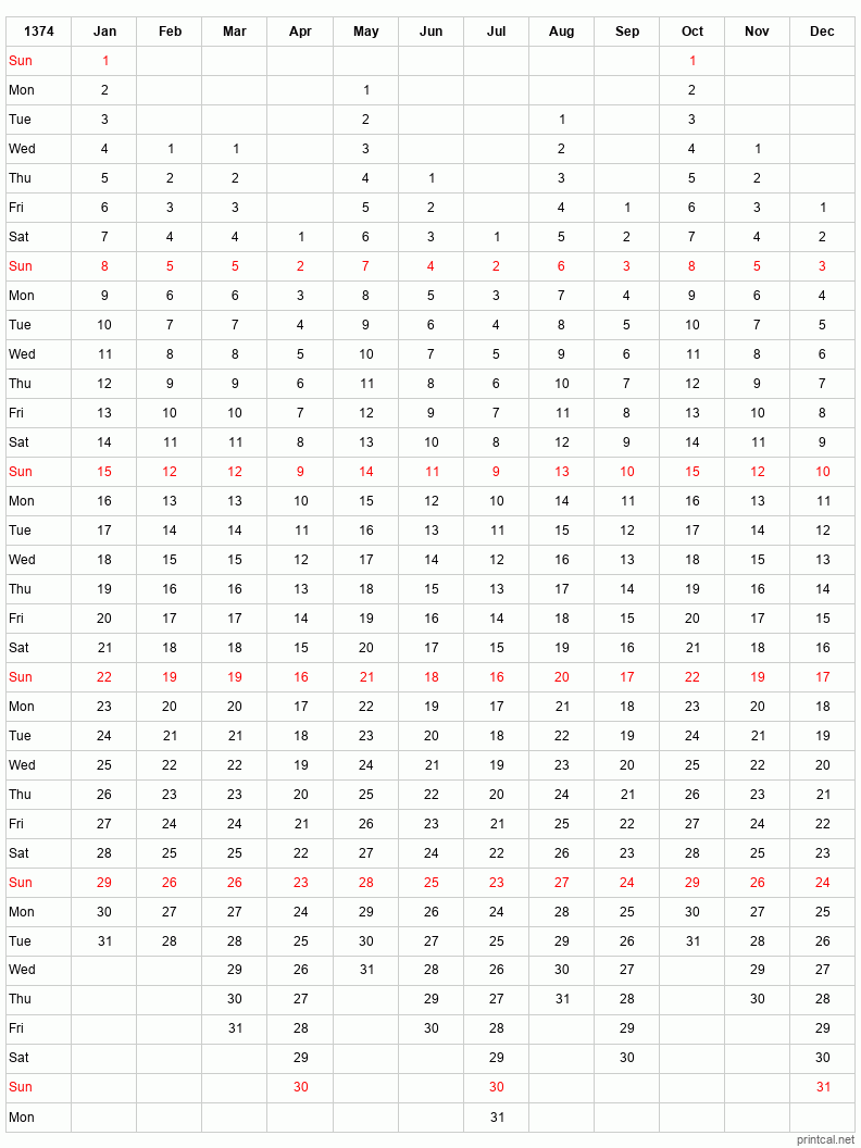 Download free printable calendar for 1374. This 12-Month One Page Calendar template is laid out in Columnar style. To change first day of the week to Monday, click here.
