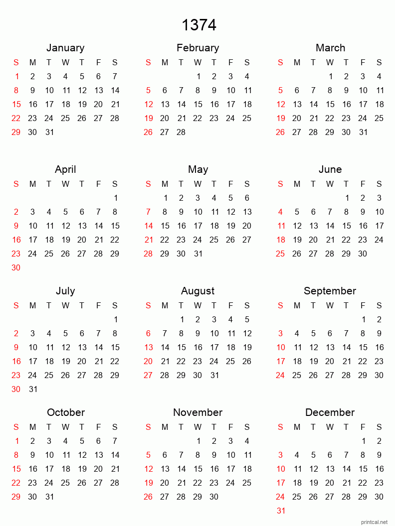 Download free printable calendar for 1374. This Yearly Calendar template is laid out in Tabular style. To change first day of the week to Monday, click here.