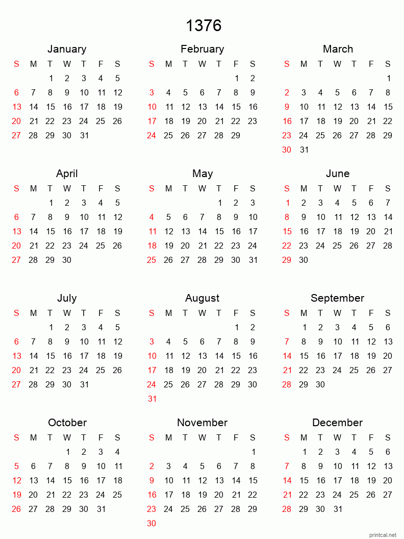 Download free printable calendar for 1376. This Yearly Calendar template is laid out in Tabular style. To change first day of the week to Monday, click here.
