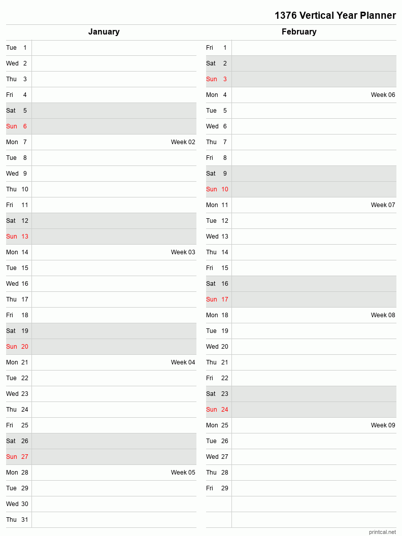 Download our vertical year planner for free. The planner is laid out in a standard format with two months per page and also includes the corresponding week number for every week.