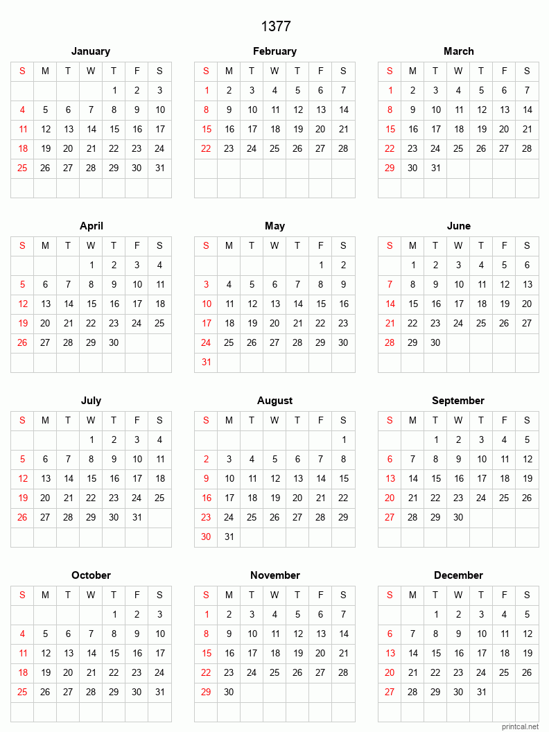 Download free printable calendar for 1377. This Full-Year Calendar template is laid out in Grid style. To change first day of the week to Monday, click here.