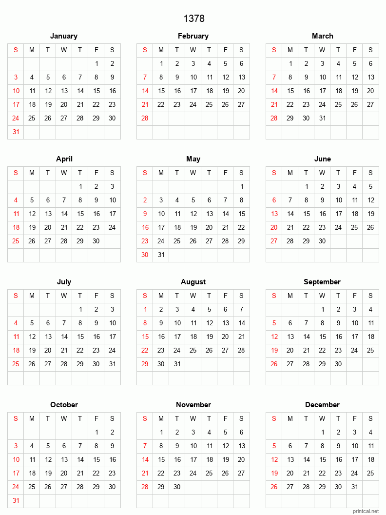 Download free printable calendar for 1378. This Full-Year Calendar template is laid out in Grid style. To change first day of the week to Monday, click here.