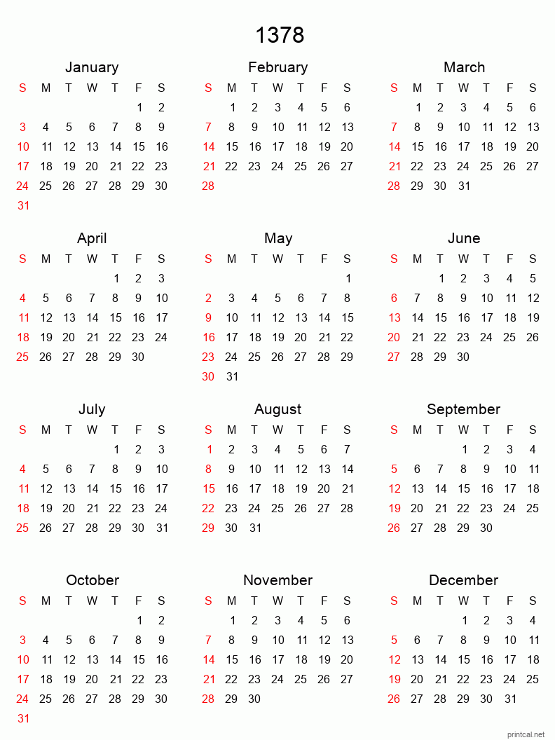Download free printable calendar for 1378. This Yearly Calendar template is laid out in Tabular style. To change first day of the week to Monday, click here.