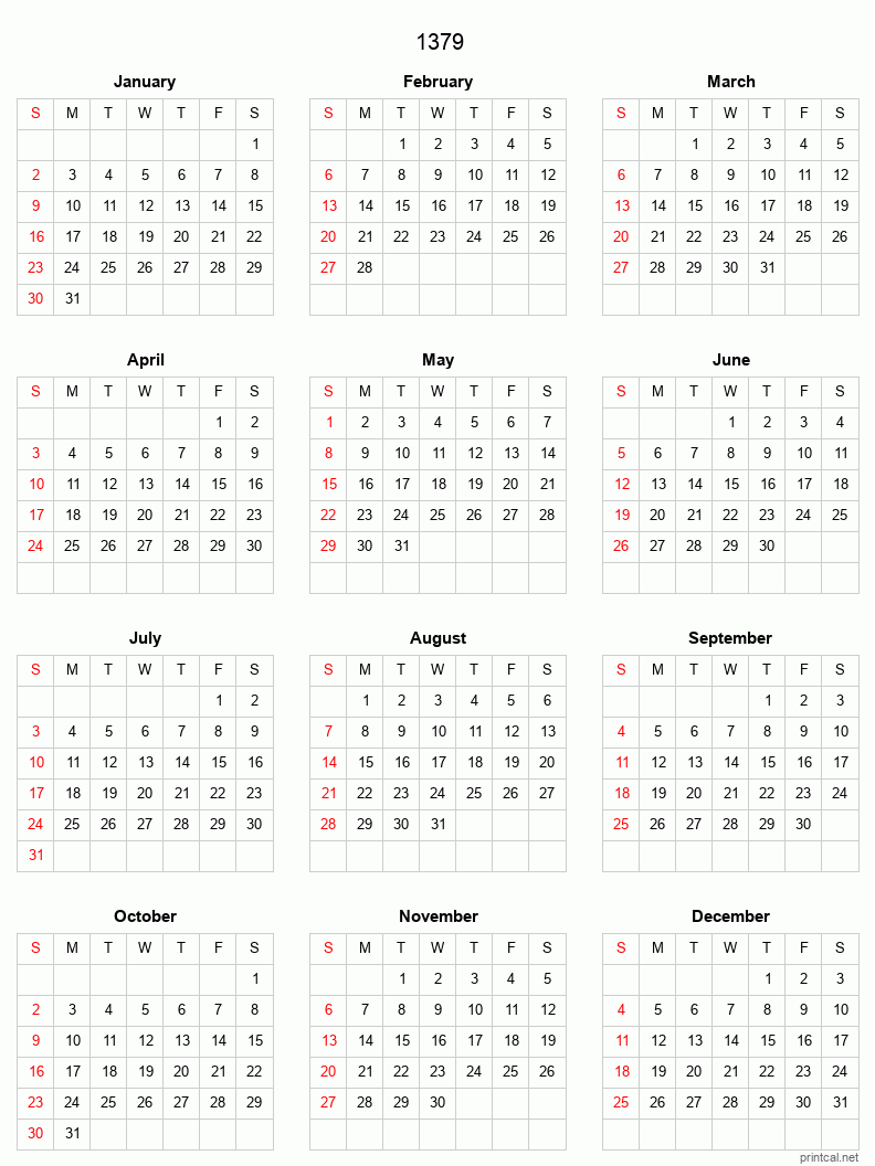 Download free printable calendar for 1379. This Full-Year Calendar template is laid out in Grid style. To change first day of the week to Monday, click here.