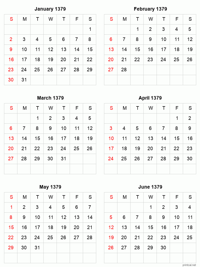 Download printable six months per page calendar for January to June 1379. To change first day of the week to Monday, click here.