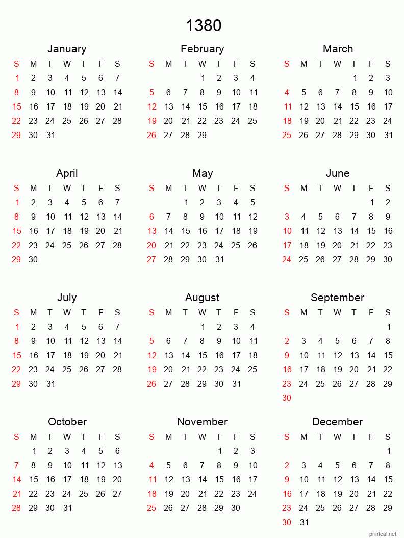 Download free printable calendar for 1380. This Yearly Calendar template is laid out in Tabular style. To change first day of the week to Monday, click here.