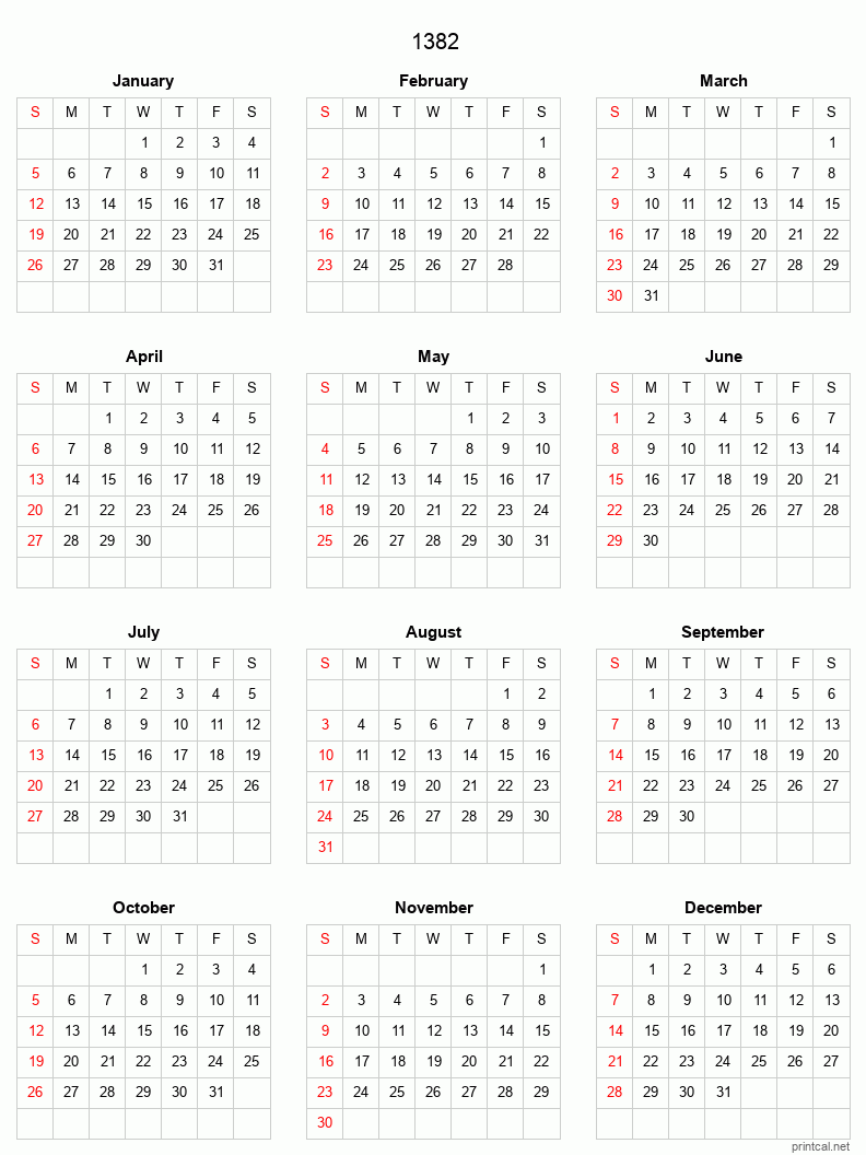 Download free printable calendar for 1382. This Full-Year Calendar template is laid out in Grid style. To change first day of the week to Monday, click here.