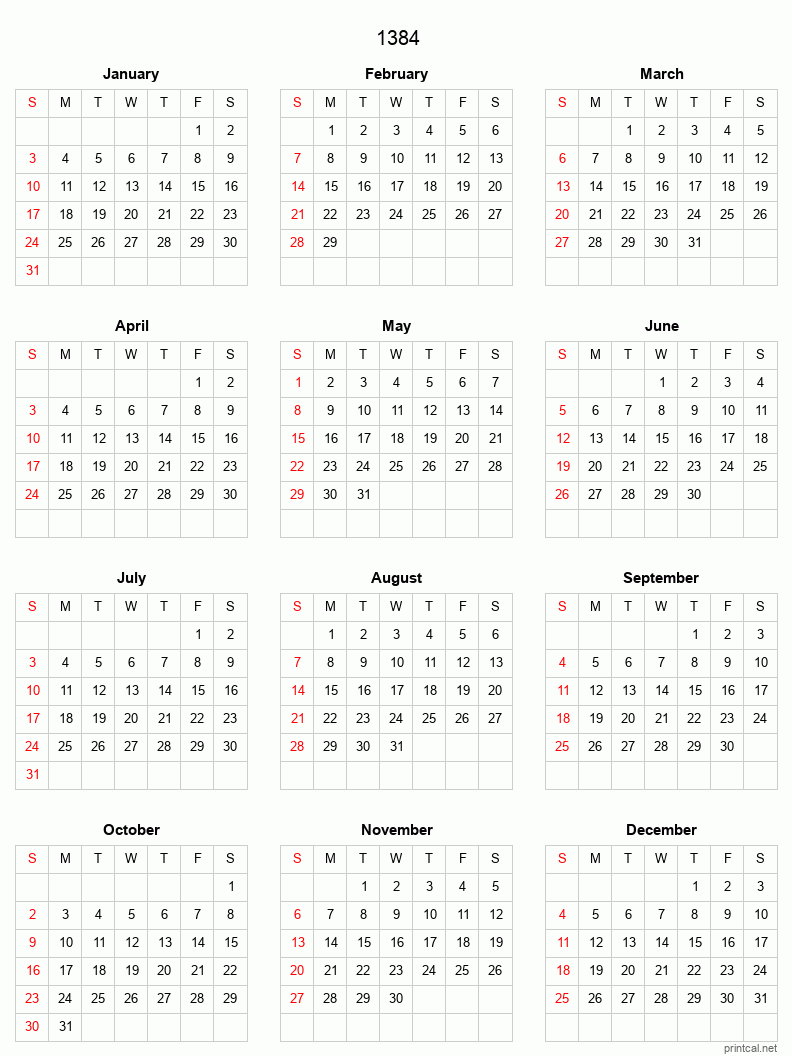 Download free printable calendar for 1384. This Full-Year Calendar template is laid out in Grid style. To change first day of the week to Monday, click here.