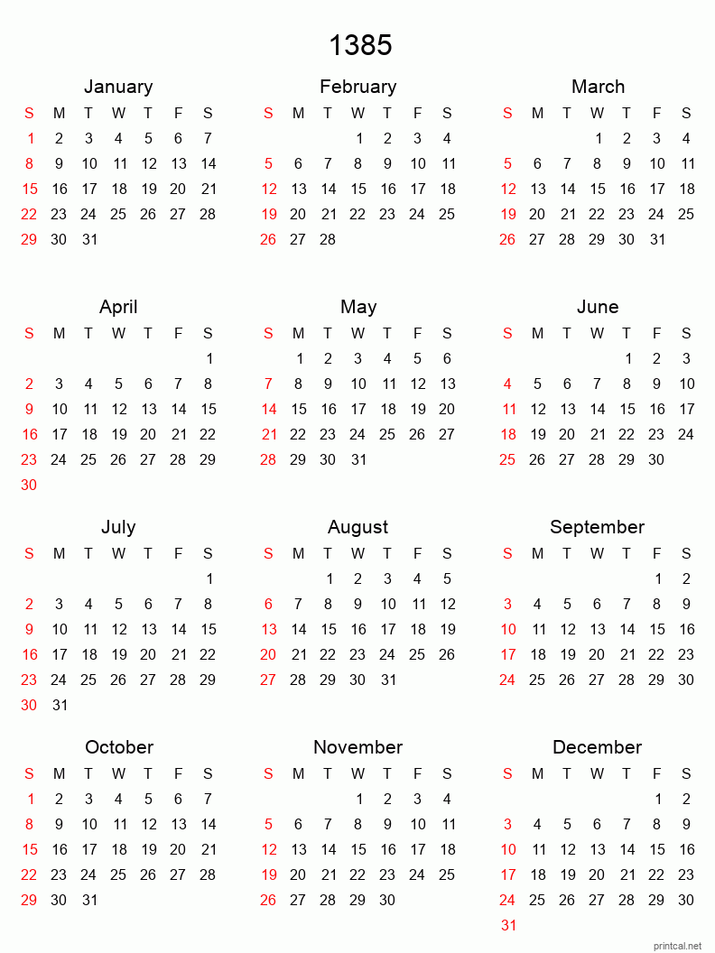 Download free printable calendar for 1385. This Yearly Calendar template is laid out in Tabular style. To change first day of the week to Monday, click here.
