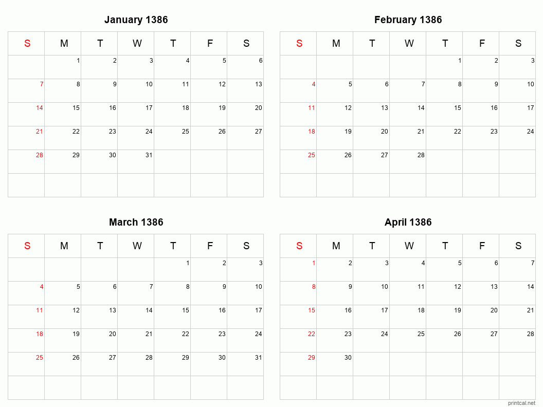 Download printable four months per page calendar for January to April 1386. To change first day of the week to Monday, click here.