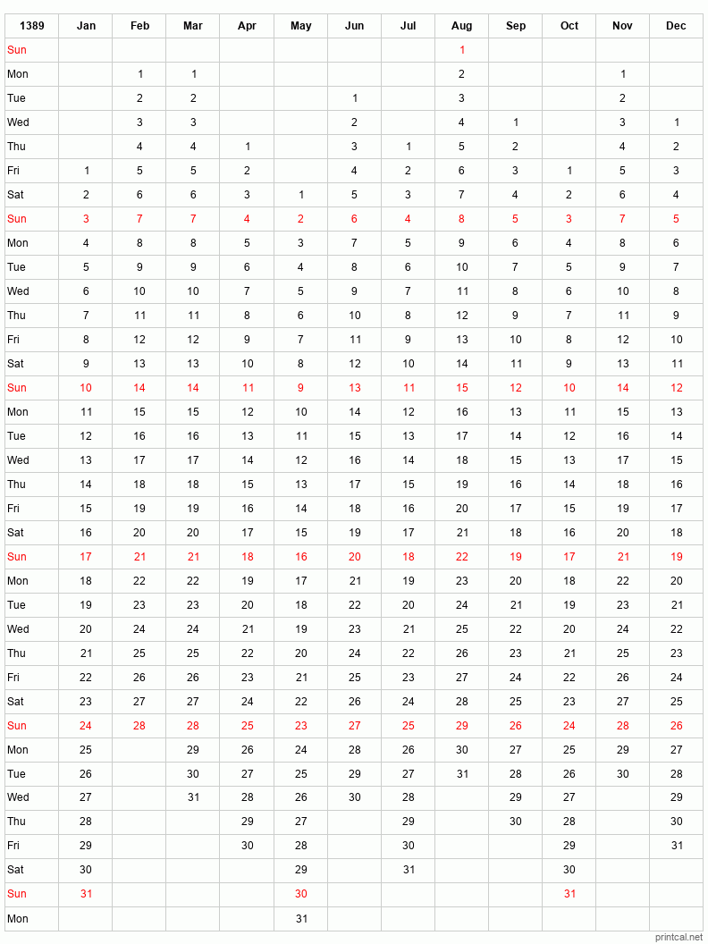 Download free printable calendar for 1389. This 12-Month One Page Calendar template is laid out in Columnar style. To change first day of the week to Monday, click here.