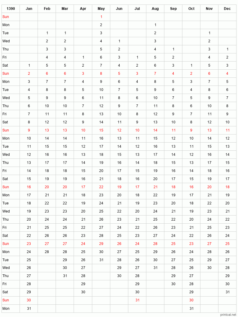 Download free printable calendar for 1390. This 12-Month One Page Calendar template is laid out in Columnar style. To change first day of the week to Monday, click here.