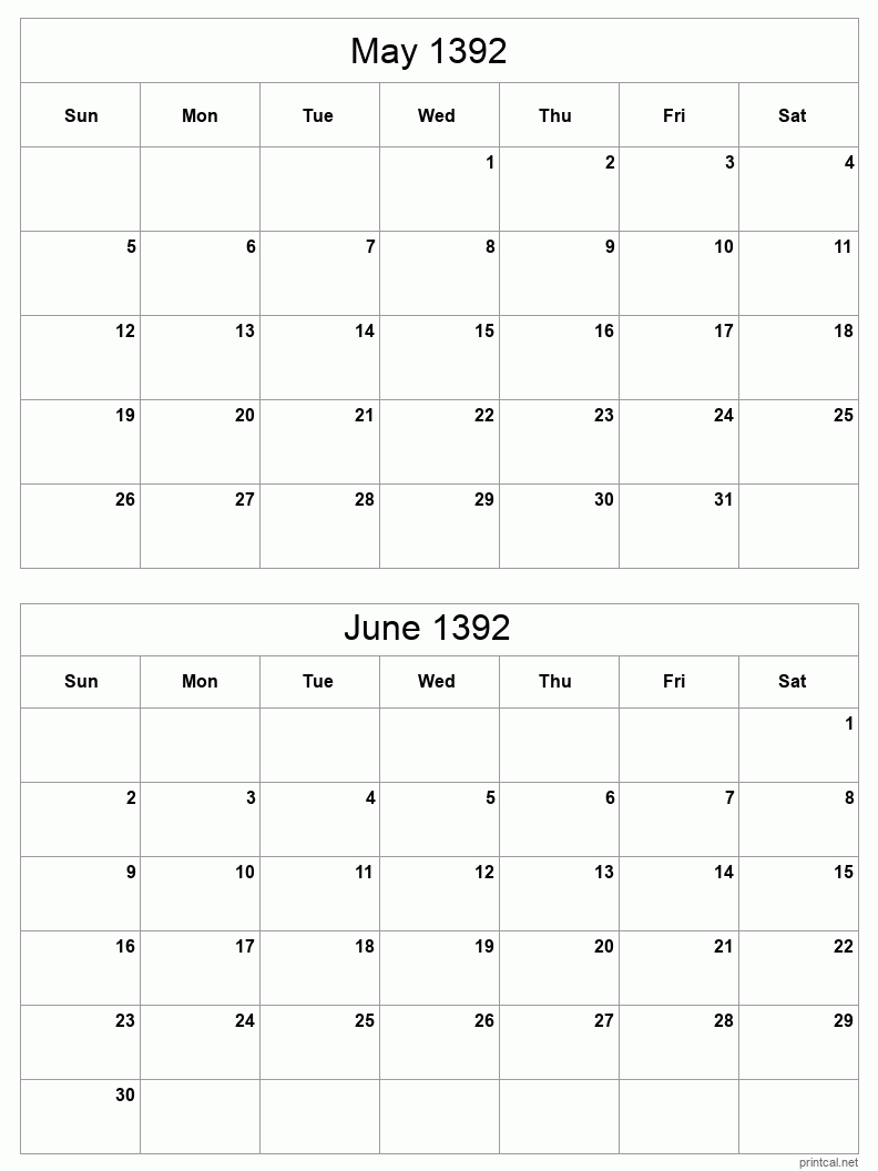 Download printable two months per page calendar for May to June 1392. To change first day of the week to Monday, click here.