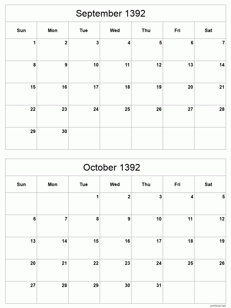 Download printable two months per page calendar for September to October 1392. To change first day of the week to Monday, click here.