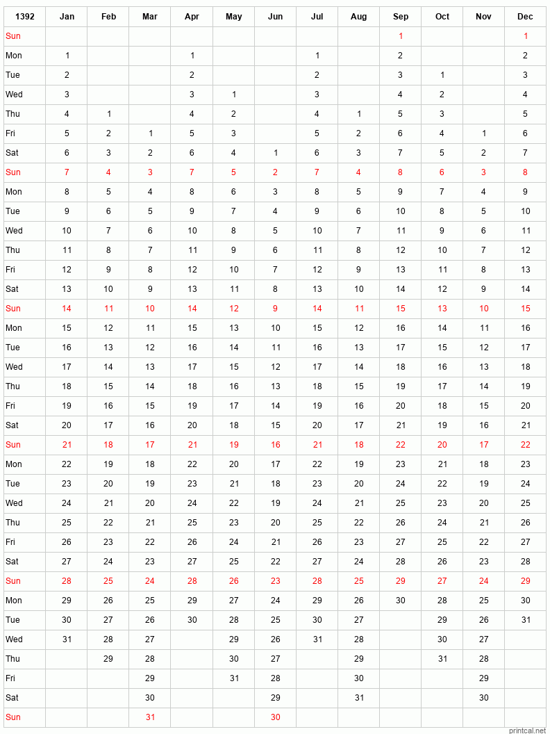 Download free printable calendar for 1392. This 12-Month One Page Calendar template is laid out in Columnar style. To change first day of the week to Monday, click here.