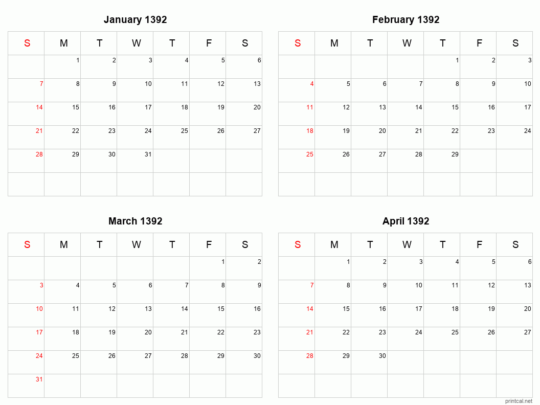 Download printable four months per page calendar for January to April 1392. To change first day of the week to Monday, click here.