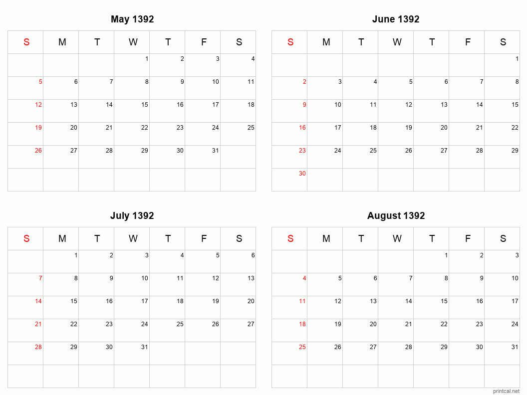 Download printable four months per page calendar for May to August 1392. To change first day of the week to Monday, click here.