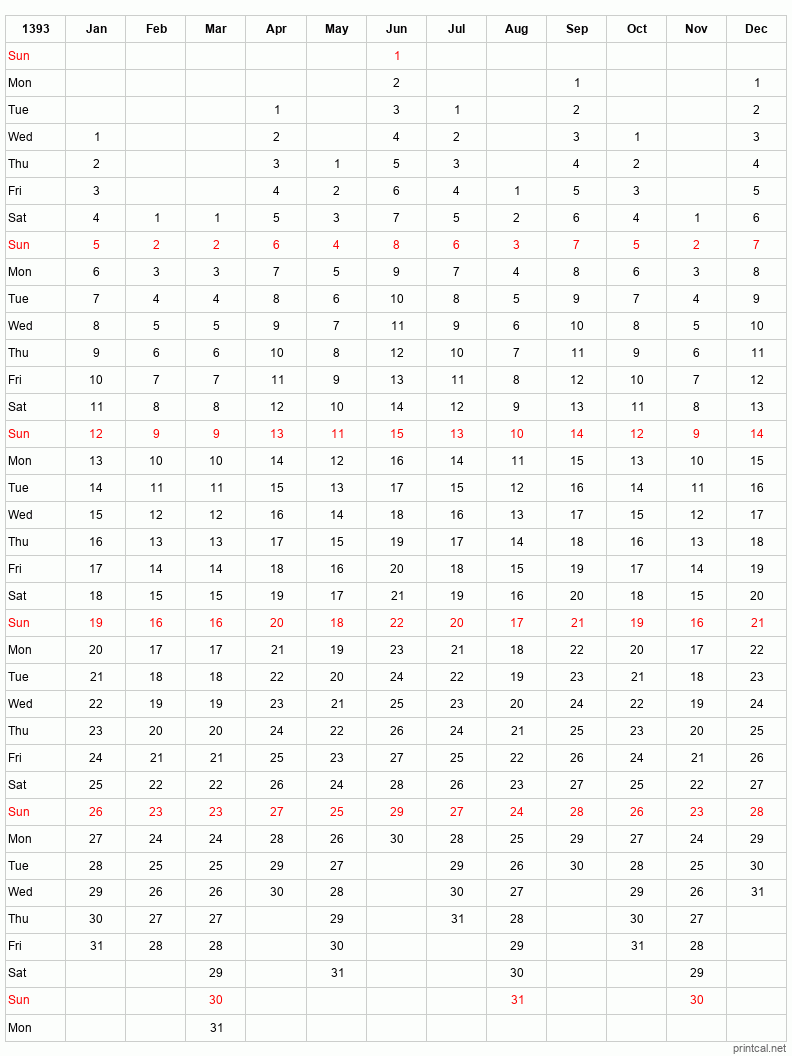 Download free printable calendar for 1393. This 12-Month One Page Calendar template is laid out in Columnar style. To change first day of the week to Monday, click here.