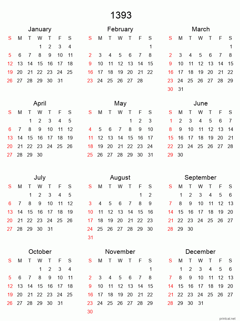 Download free printable calendar for 1393. This Yearly Calendar template is laid out in Tabular style. To change first day of the week to Monday, click here.