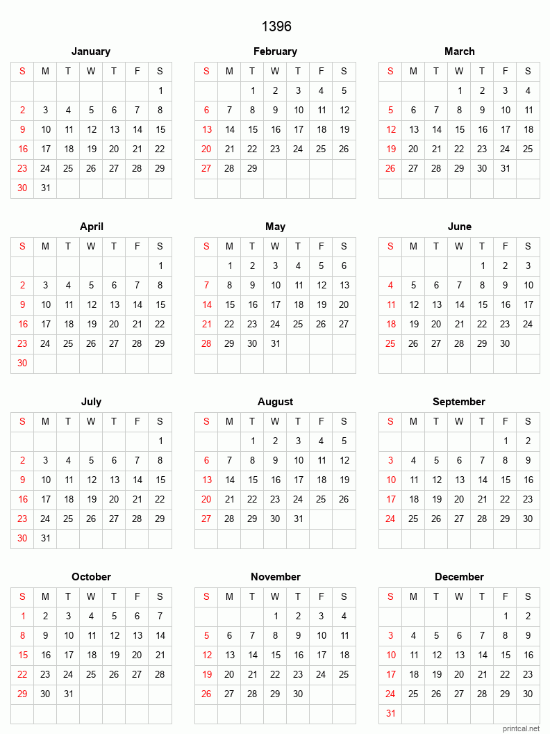 Download free printable calendar for 1396. This Full-Year Calendar template is laid out in Grid style. To change first day of the week to Monday, click here.