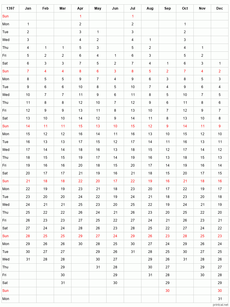Download free printable calendar for 1397. This 12-Month One Page Calendar template is laid out in Columnar style. To change first day of the week to Monday, click here.