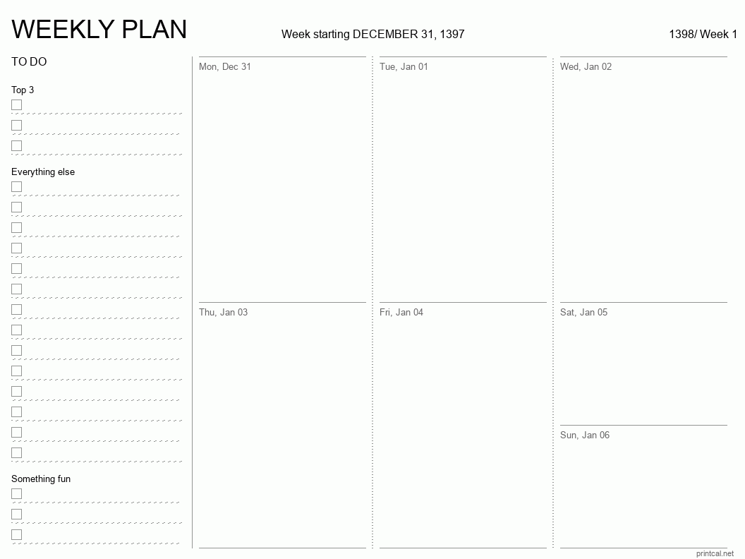 Sample Planner: 1398 weekly planner for the week starting December 31, 1397