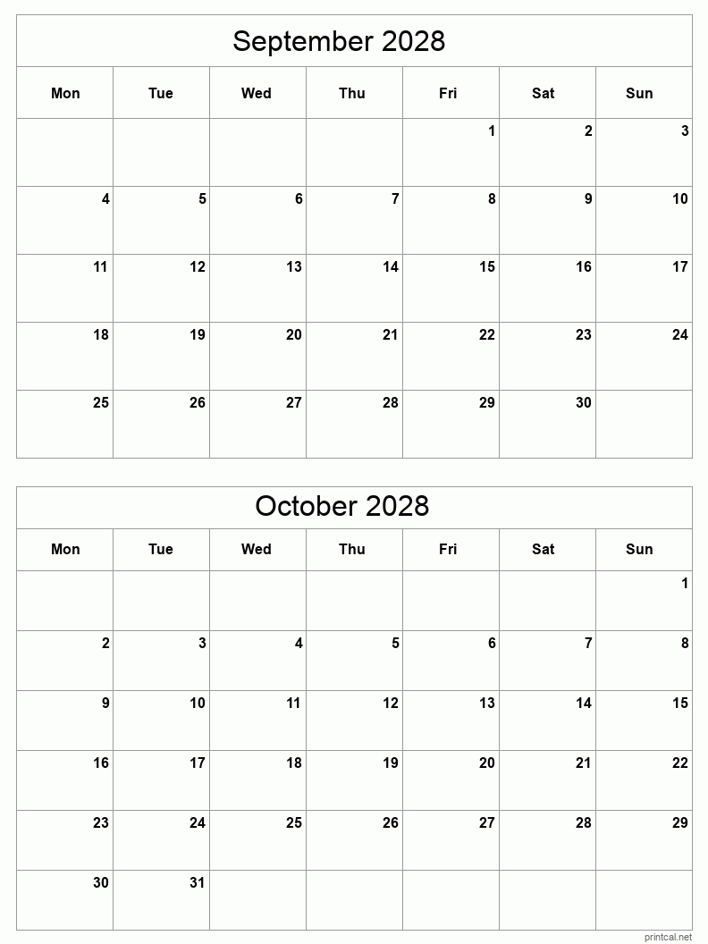 Download printable two months per page calendar for September to October 2028. To change first day of the week to Sunday, click here.
