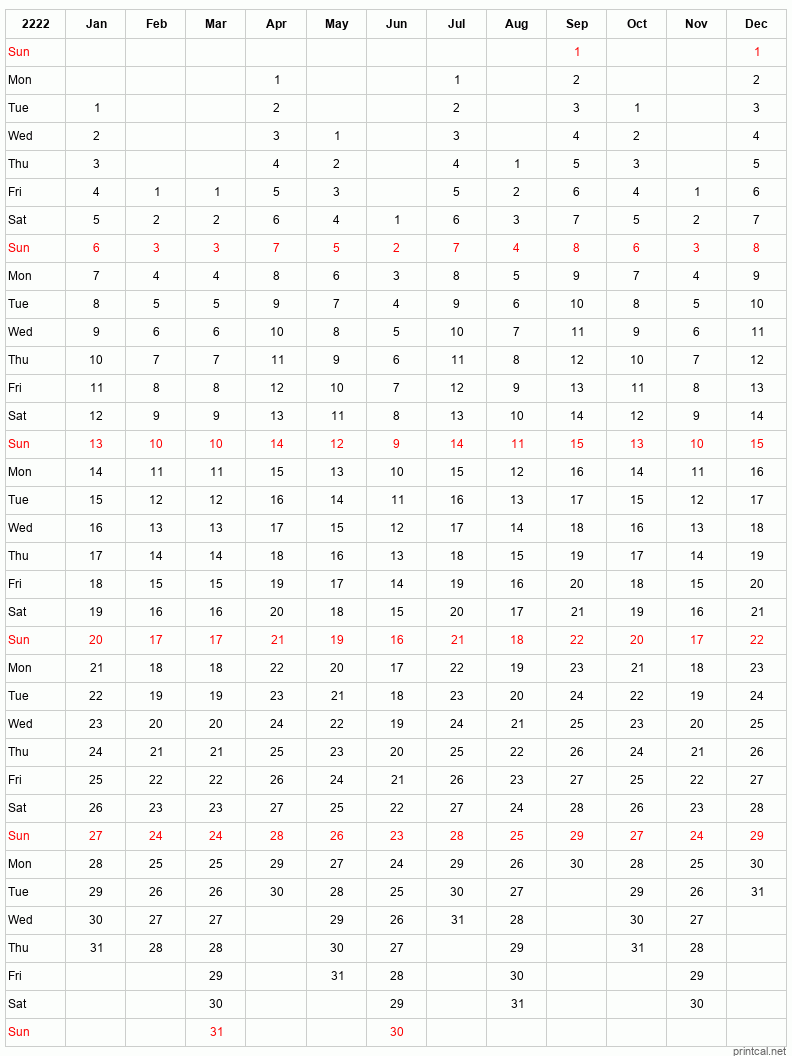 Download free printable calendar for 2222. This 12-Month One Page Calendar template is laid out in Columnar style. To change first day of the week to Monday, click here.