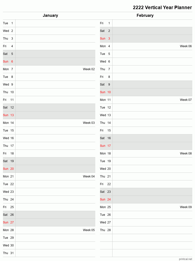 Download our vertical year planner for free. The planner is laid out in a standard format with two months per page and also includes the corresponding week number for every week.