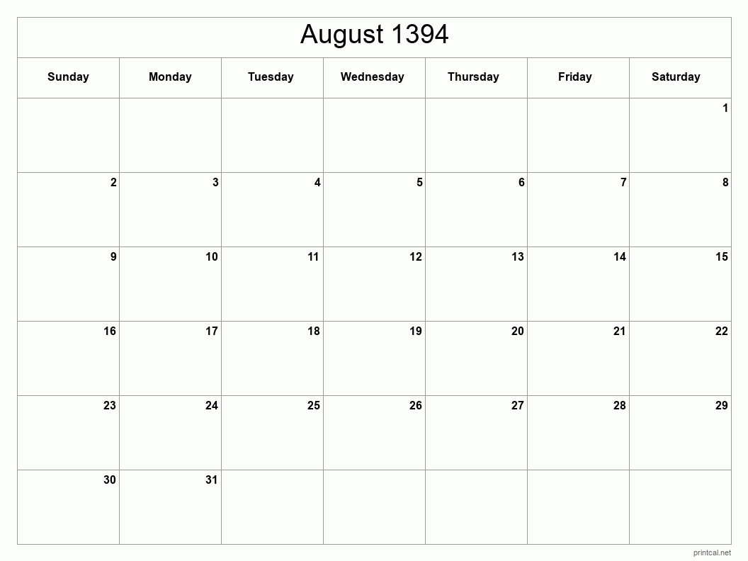 Download Classic Blank Sheet calendar for August 1394 to help you with your productivity and manage your time efficiently. To change first day of the week to Monday, click here.