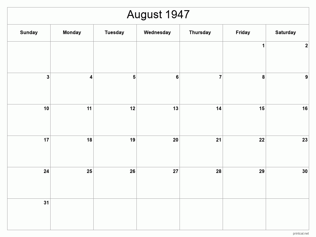 Printable August 1947 Calendar (Classic Blank Sheet)