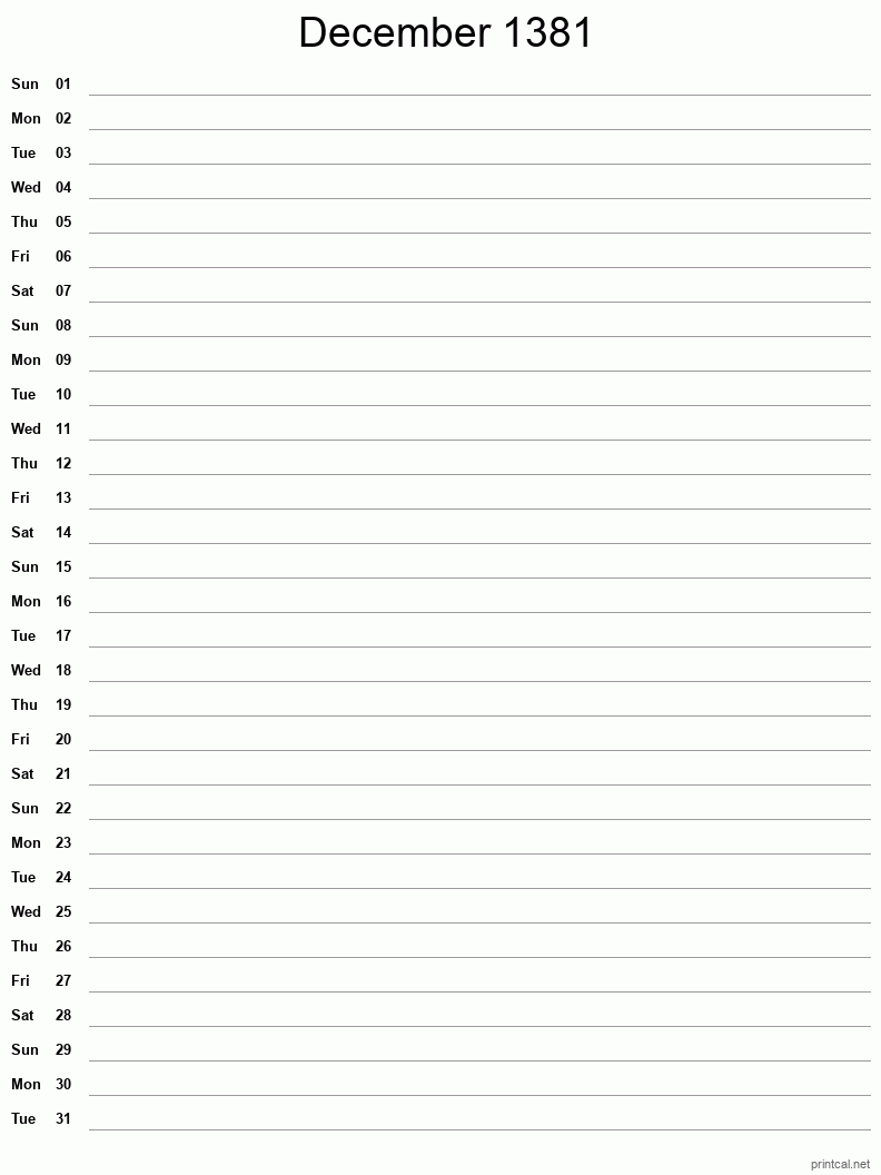 Download Single Column Notesheet calendar for December 1381 to help you with your productivity and manage your time efficiently. To change first day of the week to Monday, click here.