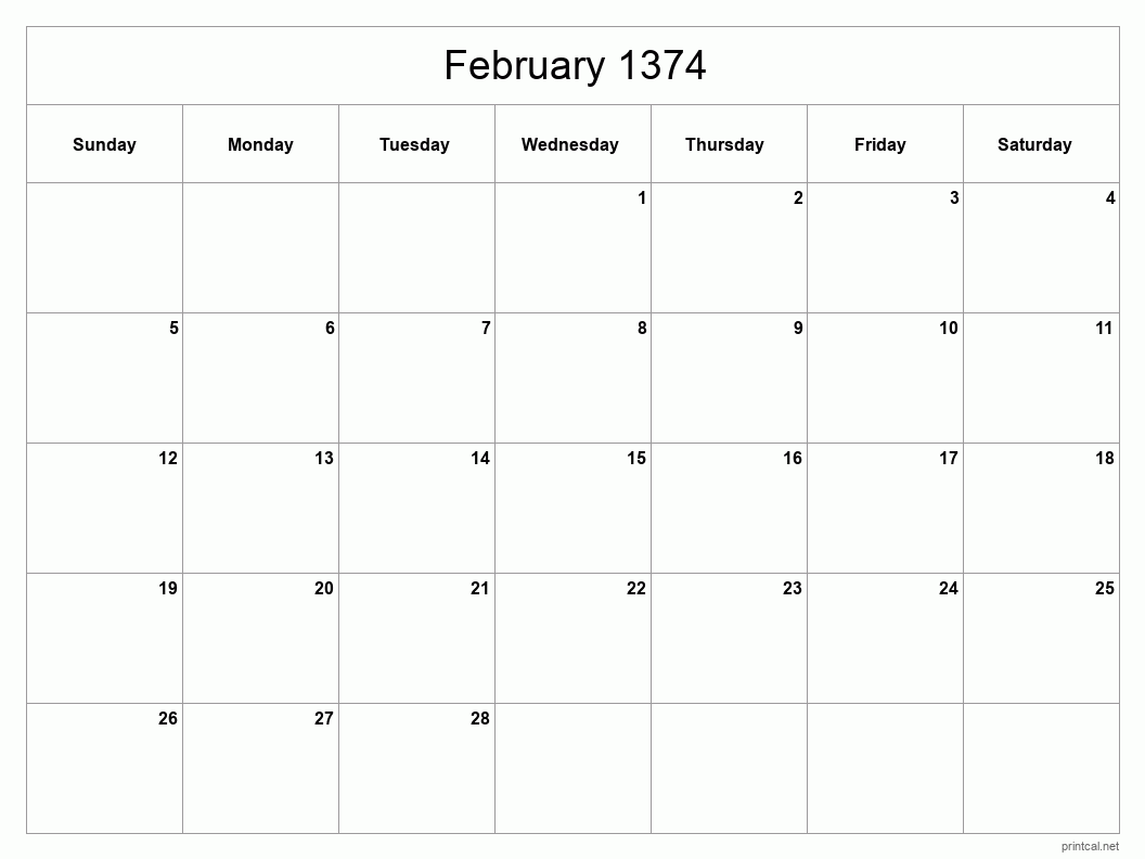 Printable February 1374 Calendar (Classic Blank Sheet)