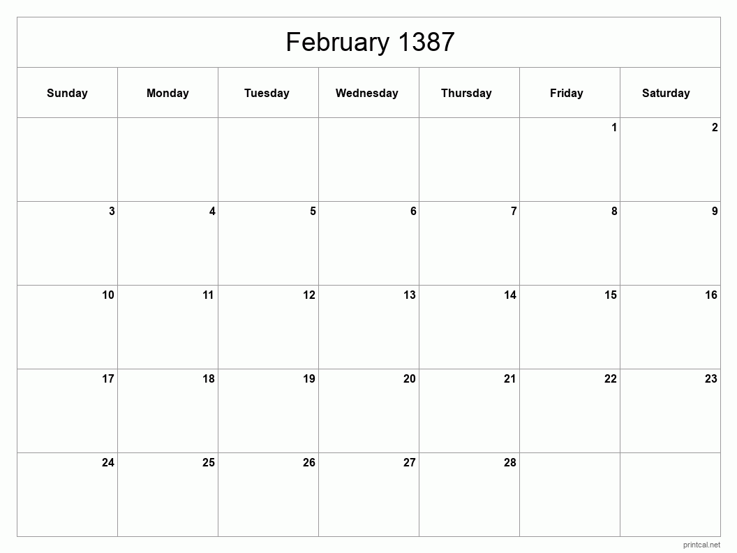 Printable February 1387 Calendar (Classic Blank Sheet)