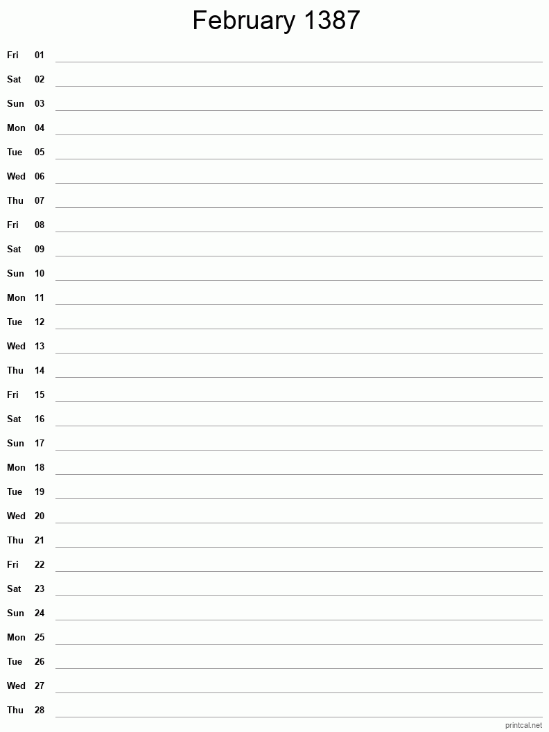 - February 1387 Calendar - Classic Blank Sheet