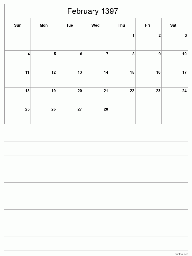 Download Half-Page With Notesheet calendar for February 1397 to help you with your productivity and manage your time efficiently. To change first day of the week to Monday, click here.