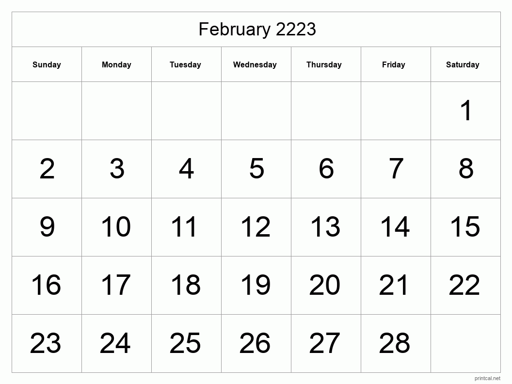Download Big Dates calendar for February 2223 to help you with your productivity and manage your time efficiently. To change first day of the week to Monday, click here.