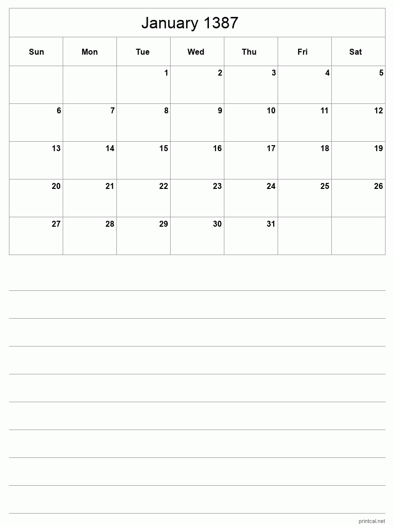 Download Half-Page With Notesheet calendar for January 1387 to help you with your productivity and manage your time efficiently. To change first day of the week to Monday, click here.