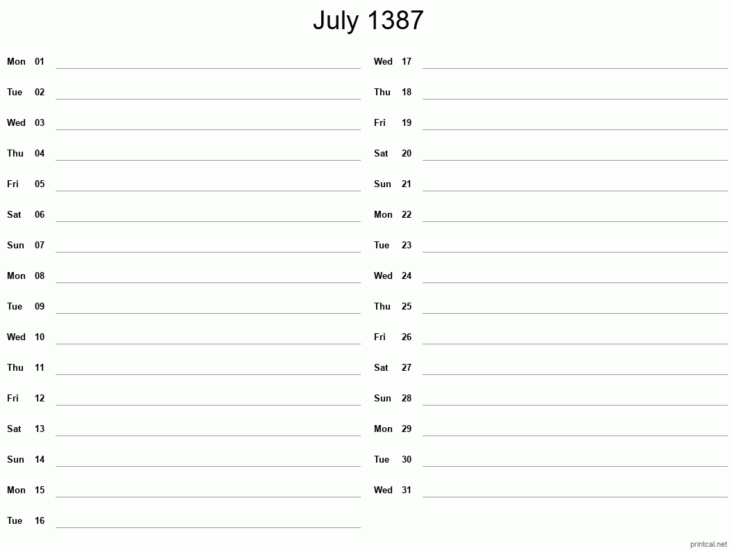 Download Two Column Notesheet calendar for July 1387 to help you with your productivity and manage your time efficiently. To change first day of the week to Monday, click here.