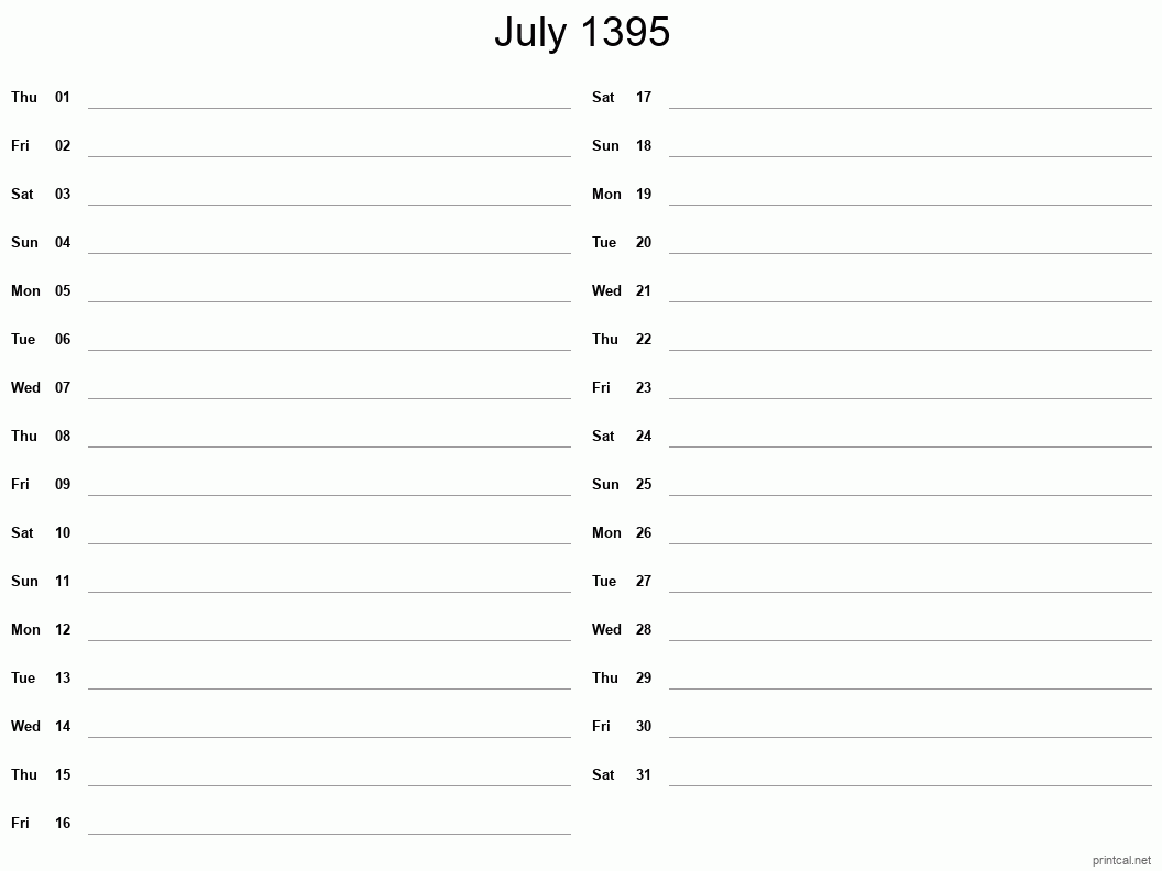 Download Two Column Notesheet calendar for July 1395 to help you with your productivity and manage your time efficiently. To change first day of the week to Monday, click here.