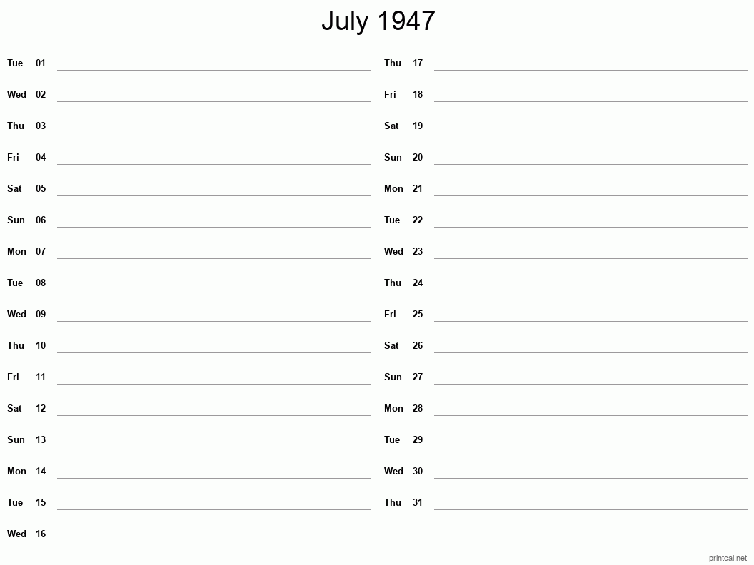 Download Two Column Notesheet calendar for July 1947 to help you with your productivity and manage your time efficiently. To change first day of the week to Monday, click here.