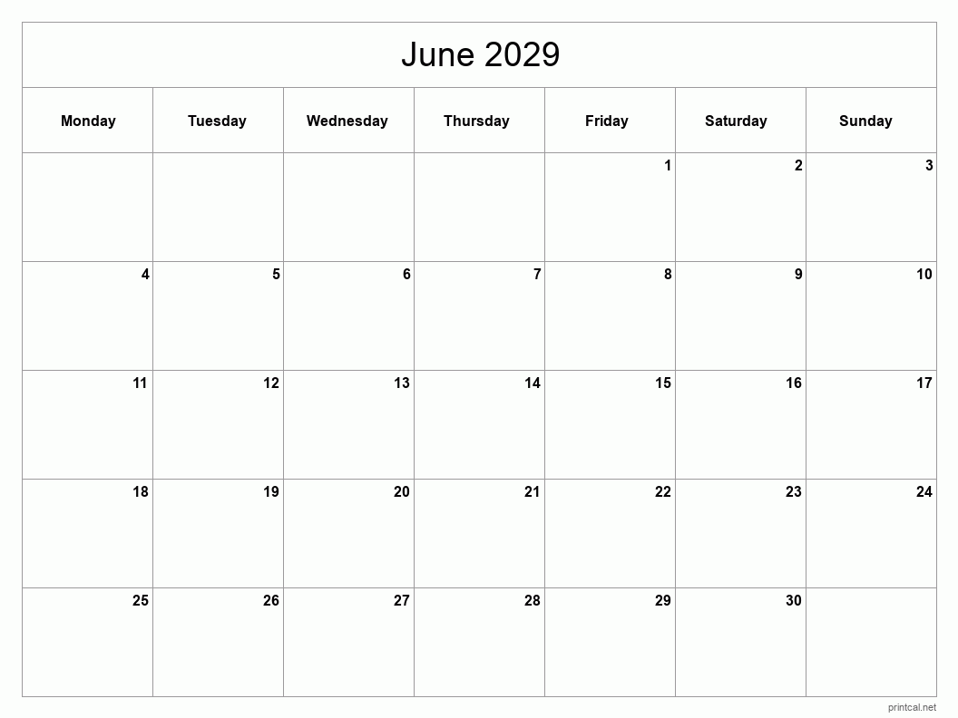 Download Classic Blank Sheet calendar for June 2029 to help you with your productivity and manage your time efficiently. To change first day of the week to Sunday, click here.